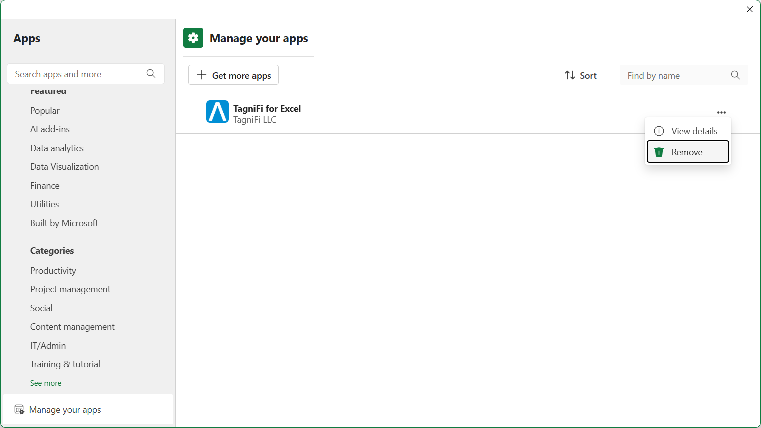 Select Manage your apps in the lower left corner. Next, select the three dots (...) to the right of TagniFi for Excel and then select Remove to remove the TagniFi Excel Add-In.