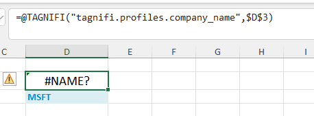 If a TagniFi value in your model exhibits the #NAME? error code on recalculation, this means that there is a communication issue between Excel and the TagniFi add-in.