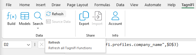 - Once reinstalled, open the TagniFi ribbon tab and select the Refresh button to recalculate all TagniFi values. Log in with your TagniFi credentials if/when prompted.