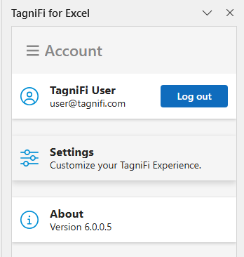 - Open the TagniFi ribbon tab and select the Account button. From the Account page, select Settings.
